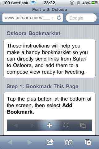 Safariが起動し、「Post with Osfoora」というページに連れてこられてしまいます。そのページにはわかりやすくブックマークレットの登録方法が記載されています。