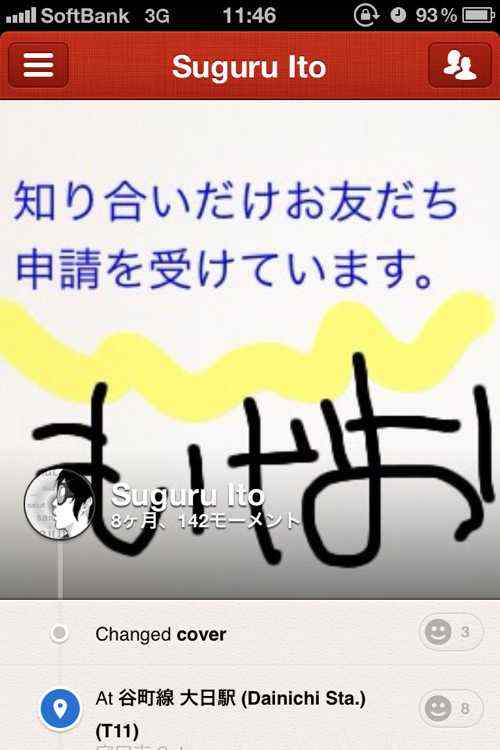 facebookなら自己紹介のところに「知り合いの方のみ友だち申請受け付けてます」みたいなことを書けますが、Pathって知り合いありき、なので自己紹介するところがないんですよね。そんなときにどうするか、思いついちゃいました。