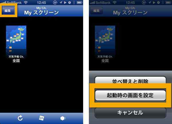 ▲登録した予報があります。「編集」をタップして「起動時の画面を設定」をタップ。