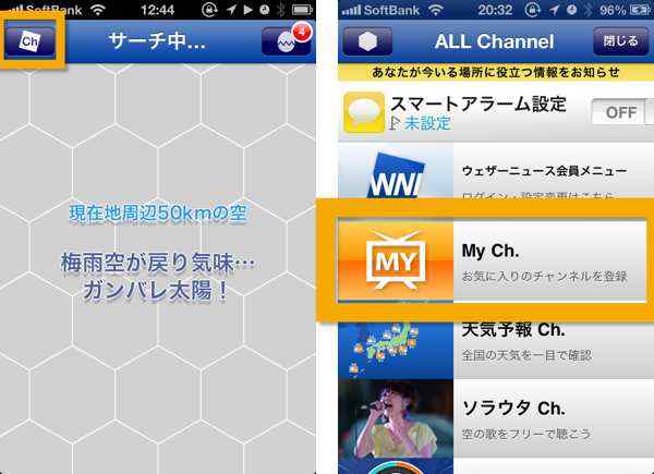 ▲起動時の蜘蛛の巣。「Ch」タップして「My Ch.」へ。