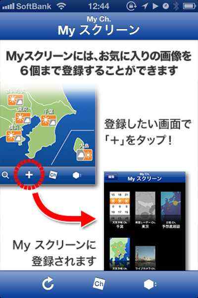 ▲予報を出す。+ボタンをタップ。「Myスクリーンに登録する」。終わり。