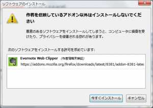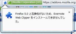 ](https://addons.mozilla.org/ja/firefox/addon/evernote-web-clipper/>Evernote Web ClipperがまだFirefox5に対応していないようです。インストールしようとすると先ほどのFiregestureのように対応してないよと怒られてしまいます。