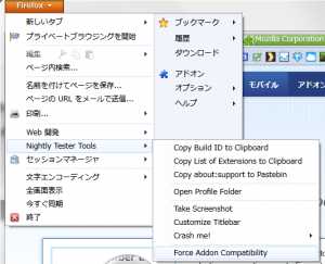 そこで、先ほどインストールしたNightly Tester Toolsのお力をお借りします。 メニューから、Nightly Tester Toolsより、「Force Addon Compability」を選択すると、強制アドオンインストールが可能になります。Firefoxの再起動を求められるので、再起動を。