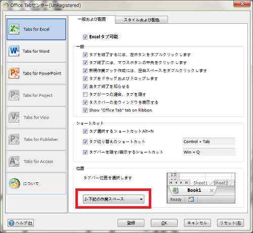 この設定画面で変えてるのは1つ。下にタブを配置するように変更してます。シートは下で切り替えると思うので、ブックもついでに下で切り替えられるようにしてます。シートは下でブックは上で…よりは、両方下にあった方が何も考えずに変更できると考えます。