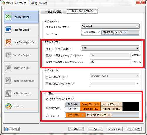 タブの幅を固定の150ピクセルに変更しています。(デフォルトは自動で300ピクセル)ブック数がそんなに多くなることはないですが、数によってタブの長さが変わるのは結構苦手です。